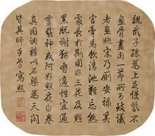 明初书法一字万同,台阁体盛行。沈度学粲兄弟推波助澜将工稳的小楷推向极致。凡金版玉册,用之朝廷,藏秘府,颁属国,必命之书,二沈书法被推为科举楷则。明初书法家有擅行草书的刘基、工小楷的宋潦、大众精篆隶的宋遂和名满天下的章草名家朱克。和祝允明、文徽明、王宠三子。